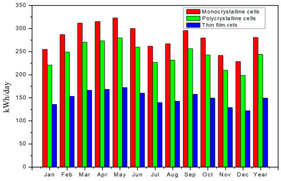 Even though the NZEBs consumed much less energy compared to the reference building, the electricity of rooftop PV systems should be used to supply the low-energy consumption to achieve NZEBs. So, the building works well with as little fossil energy as possible. One of the most important design principles of NZEBs is to provide renewable electricity for the low-energy building. Domestic hot water is supplied by a solar heating system with the collectors mounted on the building’s façade. This study took advantage of the vacant roof to supply renewable PV electricity to the building. Monocrystalline silicon, polycrystalline silicon, and thin-film cells are frequently used in the PV system. There are both advantages and disadvantages to these three kinds of PV cells. PVsyst is used to simulate the annual electricity production of PV arrays on a roof. The annual electricity production of PV on the roof is shown in Figure 10.