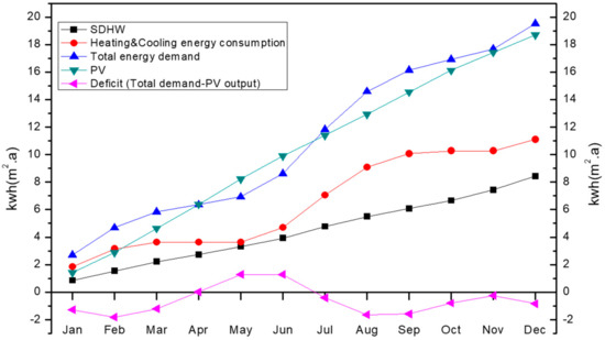 The energy consumption for space heating and cooling of NZEBs in this study is 11.1 kWh/(m2·a). The energy consumption of the auxiliary electricity heater in the solar domestic hot water system is 8.4 kWh/(m2·a). The electricity output of the rooftop solar photovoltaic system is 18.7 kWh/(m2·a). It can be seen that rooftop PV systems can supply all the electricity consumption for an air-source heat pump on a yearly basis. In addition, the PV systems on the roof can provide 95.8% of the electricity demand of heating, cooling, and auxiliary energy consumption of domestic hot water. It can be concluded that the NZEBs are possible for a typical high-rise building in Beijing.