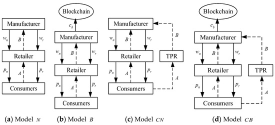 The adoption of BT not only improves consumer trust but also has a significant impact on the decisions of firms [47,48,49]. Zhang et al. [50] solved the problem of gray markets in global supply chains by leveraging the information traceability of BT. Li et al. [51] studied BT adoption strategies in a competitive market and found that the adoption of BT affects the retailer’s information leakage strategies. In addition, BT can reduce transaction costs [45,52,53] and improve information-sharing capabilities [51,54]. Liu et al. [38] and Prajapati et al. [55] given that BT plays an important role in the supply chain. However, Liu et al. [56] investigated the impact of BT on the performance of supply chains and derived that BT adoption does not bring more benefits to manufacturers.