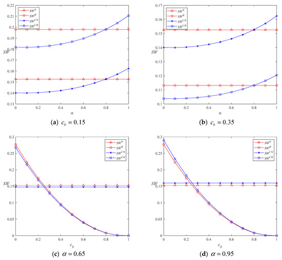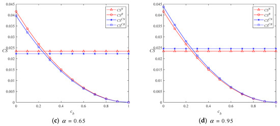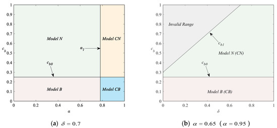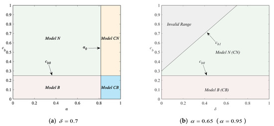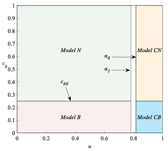 In this part, we explore the models , , and to present the equilibrium decisions. We focus on the case of to obtain equilibrium results [69,70].