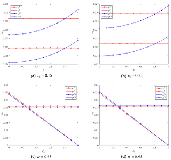 The proof of Proposition 4 can be found in Appendix H. Proposition 4 and Table 7 show that the competitive intensity affects the wholesale and retail prices, and demands for remanufactured products in the four models , , , and . First, regardless of whether BT is adopted or not, comparing the case under the R-mode, when the competitive intensity is lower than a threshold (i.e., or ), the manufacturer and retailer will increase the wholesale and retail prices when the C-mode is used, respectively. Otherwise, the manufacturer and retailer will set lower wholesale and retail prices under the C-mode, respectively. Second, comparing the case under the R-mode, the retailer decreases the recycling rates when the competitive recycling mode is implemented, whether BT is adopted or not. This indicates that although enterprises can set higher wholesale or retail prices when the competitive intensity is low, the competition will reduce their enthusiasm for recycling used products. These findings are different from the conclusions in Ranjbar et al. [1]. Third, the recycling mode and BT adoption do not affect the demands for new products in the four models, and they only affect the demands for remanufactured products. Whether BT is adopted or not, when the competitive intensity is low (i.e., ), the demand for remanufactured products is higher when R-mode is implemented than that when C-mode is implemented. That is because the retailer increases the retail prices when C-mode is implemented. Therefore, enterprises should set appropriate prices and decide recycling rates according to the competitive intensity. This finding validates the conclusion of He et al. [72].