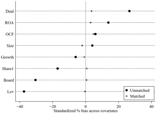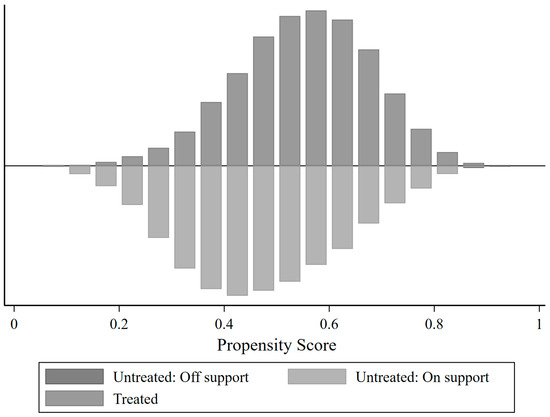 Based on the above research design, propensity score matching was conducted by dividing the manufacturing enterprises in A-share in 2012 and later into the treatment group that received the guideline impact and other enterprises as the control group. Table 5 shows the results of a propensity score matching balance test. After matching, the standard deviations of the control variables all decrease significantly, and the significance of most of the variables also decreases significantly, indicating that the difference between the two groups of data is reduced after matching. Figure 1 depicts the change in error before and after matching. Figure 2 demonstrates the common range of values for the samples, with only 27 samples unmatched, suggesting that there is a minimal loss of sample size to perform a match that does not result in a large bias.
