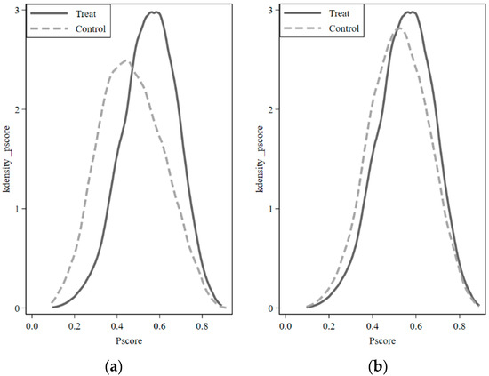 Kernel density function before and after sample matching. (a) Before matching; (b) after matching.