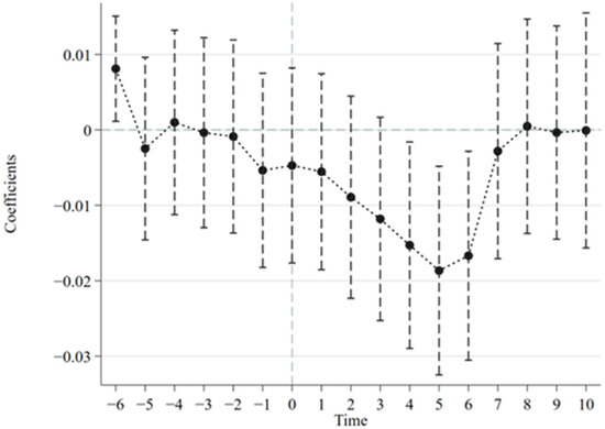 The results of the double differencing are shown in Table 6. Column (1) controls only for time and individual effects, and the cross-multiplier term Did coefficient is significantly negative at the 10% level. Column (2) adds a series of control variables and the cross-multiplier term Did coefficient is −0.009, which is significantly negative at the 5% level. This suggests that the promulgation of the Green Credit Guidelines reduces the level of financialization of manufacturing enterprises and that Hypothesis 1 is valid.