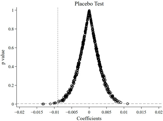 The parallel trend test is shown in Figure 4, where it can be seen that the coefficient tends to be close to zero before the implementation of the policy (T < 0) and the coefficient is significantly negative after the implementation of the policy (T ≥ 0), indicating that the implementation of the bill has an inhibitory effect on the financialization of the manufacturing enterprises. This is followed by a placebo test involving randomly assigning the experimental group with 500 replications. The results are shown in Figure 5, where most of the estimated coefficients lie around −0.005 and are insignificant, ruling out the influence of unobservable factors on the empirical results.