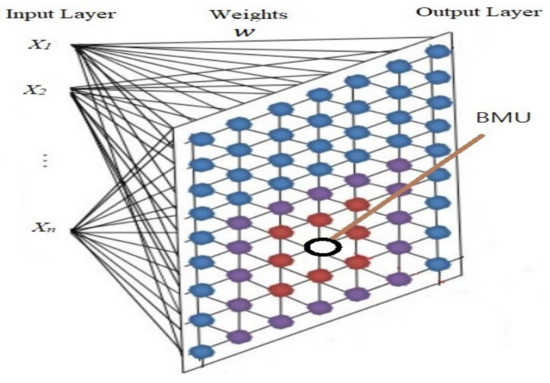 Kohonen proposed that the SOM conforms to the model of unsupervised learning networks [18]. The learning paradigm is appropriate for the SOM as long as it contains inherent clustering principles, as shown in Figure 1. There are two layers in the SOM network: the input layer and the output layer. The input layer consists of a single layer of neural configurations that are fully weight-connected to the neurons in the output layer. The number of neurons in the input layer is determined by the dimensionality of the sample. It relies on neurons competing with each other to iteratively optimize networks using competitive learning methods. Iteratively traversing each neuron in the competitive layer to calculate the distance between data x(t) and each one in the SOM. The winning node will select the neurons with the lowest distance, commonly known as the best matching unit (BMU). Equation (10) describes the learning rule.