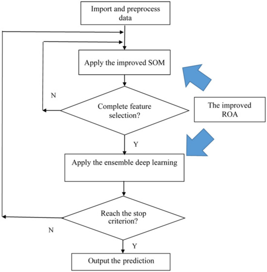 An ROA for predicting building energy consumption using feature selection and ensemble deep learning is proposed in this paper. Our goal is to create a cutting-edge model that will increase the predictability of building energy usage. The proposed model’s procedure is depicted in Figure 3. In Figure 3, the dataset of ASHRAE is imported first, and then the data are preprocessed. Data preprocessing is the process of re-examining and calibrating data to correct existing errors and provide data consistency. Then, an improved SOM is proposed to process feature selection. When the feature selection is completed, the ensemble deep learning is performed to improve its performance. In the proposed model, ROA is used to fine-tune the parameters of the improved SOM and ensemble deep learning to obtain the best prediction. The proposed model continues to run until the stop criterion is reached.