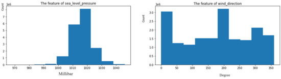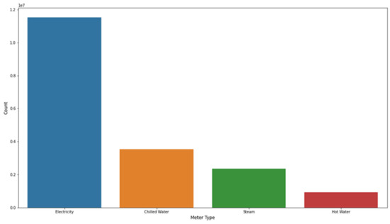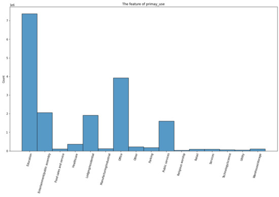 In this research, the ASHRAE energy consumption dataset is imported along with building information and historical weather data [22]. These two datasets are described in Table 1 and Table 2. The primary_use feature of the building information dataset is the indicator of the main category of construction activities, as shown in Figure 4. It appears that education is the category with the greatest amount of construction. The features of sea_level_pressure and wind_direction are depicted in Figure 5. As shown in Figure 6, there are four different forms of metering, with 0 denoting electricity, 1 denoting chilled water, 2 denoting steam, and 3 denoting hot water. The highest amount is seen in Figure 6 to be associated with electricity.