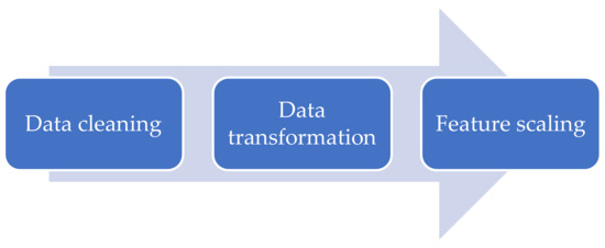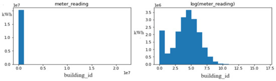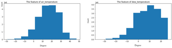 For preprocessing the data, the data are performed as follows: It first performs data cleaning and then it performs data transformation and feature scaling as shown in Figure 7. Data cleaning is the process of removing or filling missing values from a dataset. Data transformation is to regularize data into a range to compare it more accurately. Feature scaling standardizes the range of independent variables in the dataset, ensuring that all features contribute equally to the model training process. In this paper, the features of floor_count and year_built have too many missing values in the building information dataset. These features refer to the actual number of floors in the structure and the year of the building, respectively. Due to the lack of real-world data, these two features are removed from the preprocessing data. However, the median value is used to fill in the missing values for the weather dataset. The features of air_temperature and dew_temperature are shown in Figure 8 in Celsius. The dew_temperature feature means the temperature at which the atmosphere is saturated with water vapor. The figure shows that the dew_temperature feature is slightly skewed. The meter_reading feature is the output label, and it means energy consumption in kWh (or equivalent). The meter_reading feature is shown in Figure 9. As can be seen, the meter_reading is extremely skewed to the left, so log transformation is applied to fix the skewness. Thereafter, normalization is used to scale features into a range between 0 and 1. It prevents certain features from dominating the model training due to their larger scales, promoting better model performance and convergence.