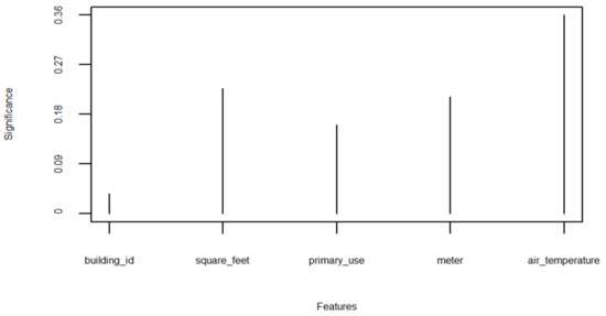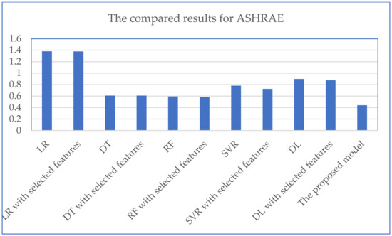 where is the RMSE of the th solution. Because we want to obtain the best selected features and prediction accuracy, we set the stop criterion as the output value that is not further ameliorated after 30 consecutive iterations or reaches the maximum number of iterations. The metric is the RMSE of the log for meter_reading. Table 4 and Figure 10 list the outcomes of various methods for ASHRAE. These contrasted methods include linear regression (LR), decision tree (DT), random forest (RF), support vector regression (SVR), deep learning (DL), Ridge, Lasso, SGD Regressor, ElasticNet, and the proposed model [24,25]. Note that the initial network of the proposed model and DL share the same basic structure. The stop condition is the same for all approaches. From the results, LR, Ridge, Lasso, and SGD Regressor have competitively close RMSE. ElasticNet performed worst out of all compared models, indicating its unsuitability for such a problem. It is demonstrated that the proposed model has the lowest RMSE. In addition, Figure 11 illustrates the results of the top five most essential features. From Figure 11, air_temperature, square_feet, meter, primary_use, and building_id are the selected features. The feature of air_temperature is a crucial factor that directly influences the energy demand for building heating and cooling systems. Variations in external and internal temperatures can affect energy consumption levels. Higher or lower temperatures may require increased heating or cooling efforts, leading to fluctuations in energy usage. The size of a building, represented by the feature of square_feet, plays a significant role in determining energy consumption. Larger buildings typically require more energy to heat, cool, and light space than smaller buildings. Understanding the feature of square_feet helps in assessing the overall energy needs and efficiency of a building. Meter type refers to the specific utility meter measuring energy consumption within a building. Different meter types can track electricity, gas, water, or other utilities. By considering the feature of the meter, the model can account for the specific energy sources and consumption patterns, enabling more accurate predictions of energy usage. The feature of primary_use indicates its intended function, such as office, residential, retail, or educational purposes. Each building type has unique energy consumption patterns based on occupancy, equipment usage, and operational hours. Understanding the feature of primary_use helps tailor energy management strategies and optimize consumption for specific building categories. The feature of building_id serves as a unique identifier for individual buildings in the dataset. By including building_id as a feature, the model can capture site-specific characteristics, such as building design, location, and historical energy usage trends. Analyzing the feature of building_id enables personalized energy consumption predictions based on the building’s unique attributes. It is noted that the air_temperature feature plays the most important role in building energy consumption.