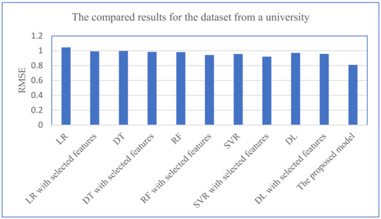 We also utilize another dataset to demonstrate the performance of the proposed model. In this scenario, data were obtained from a university. The data collection instruments include the acquisition terminal, a soil pressure gauge, a water pressure gauge, a rain gauge, a steam gauge, an inclinometer, temperature and humidity sensors, and a static level. There are a total of 35 features obtained from these instruments. There are six features extracted from the proposed model. The comparison of results for this dataset is shown in Table 5 and Figure 12. From the results of Table 4 and Table 5, the approaches with feature selection have better performance than traditional approaches. It also shows that the proposed model also has the best performance in these compared approaches.
