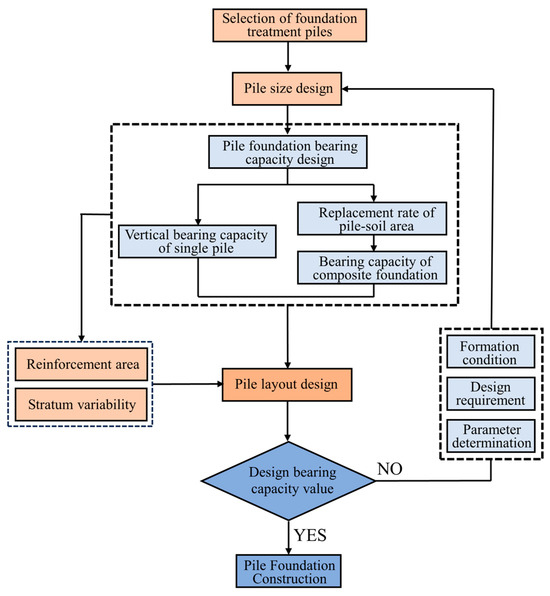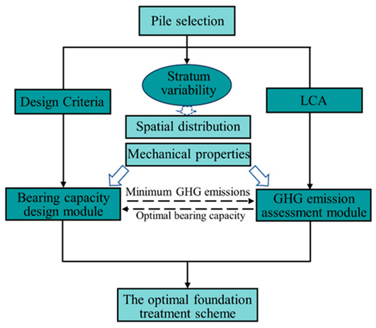 Therefore, pile foundation design should not only incorporate considerations of bearing capacity and environmental factors but also comprehensively understand the complexity and diversity of geological conditions. This implies that while aiming to reduce GHG emissions, design decisions must also ensure that structural safety, stability, and functionality remain uncompromised. The purpose of this study was to assess the potential for carbon reduction in foundation treatment piles based on the LCA framework. First, the design process and GHG emission assessment scheme for foundation treatment piles were introduced in detail. Subsequently, the impact of geological variability on the pile construction process was examined, and the effects of various factors on the GHG emissions and bearing capacity of the piles were evaluated. Finally, a comprehensive comparative assessment of various construction schemes for foundation treatment piles was performed from a design perspective, and new construction schemes that favor emission reduction were introduced. The results of this study not only establish a theoretical foundation for assessing GHG emissions at the early design stages of underground pile foundation technology but also offer a viable pathway for achieving low-carbon construction in underground engineering projects.