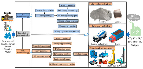 Global climate change is intensifying, marked by rising temperatures and increasingly frequent extreme weather events, which is causing widespread global concern. The construction industry, which is a major source of global energy consumption and greenhouse gas (GHG) emissions, plays a critical role in environmental sustainability [1,2,3,4]. According to a report by the United Nations Environment Program (UNEP) [5], buildings and the construction industry account for over 34% of the global energy demand. Thus, developing effective strategies to reduce the carbon footprint of the construction industry is not only an urgent response to climate change but is also crucial for advancing sustainable development goals [6,7,8]. In particular, foundation treatment piles are essential for construction under complex geological conditions [9]. However, the construction process of foundation treatment piles also entails significant GHG emissions, which not only increase environmental stress but also challenge the green and low-carbon development goals of the construction industry.