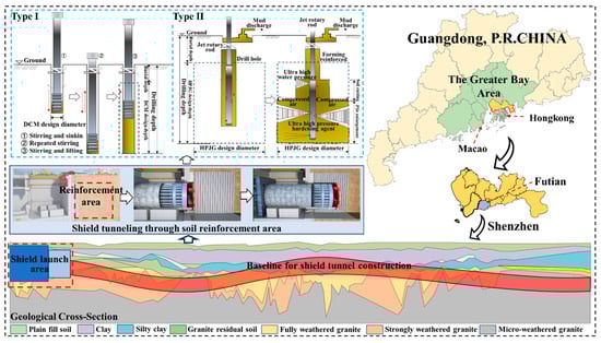 The Guangzhou–Dongguan–Shenzhen Intercity Railway offers essential transportation infrastructure support to facilitate the accelerated development of the Shenzhen–Hong Kong Innovation Cooperation Zone. This project employs a single-tube double-track circular shield tunneling technique with a shield diameter of 12.8 m. Situated in the Futian District of Shenzhen, an area densely populated with high-rise buildings and lined with numerous structures, stringent control of ground settlement is imperative. Shield tunneling construction is divided into three phases: launching, interval tunneling, and arrival at the reception stage, the shield launch being a pivotal phase [51] that significantly influences the construction quality of the shield tunnel. Shield launching typically requires pre-reinforcement of the soil ahead of tunneling to sufficiently support the tunnel face and prevent collapse [52]. The project incorporates two innovative foundation treatment pile technologies, depicted in Figure 4: DCM piles, which utilize cement as the primary solidifying agent and mix it with the foundation soil using deep mixing machinery to create a vertically reinforced composite foundation, and HPJG piles, where a high-pressure cement slurry is ejected horizontally from rotating drill rod nozzles, cutting through the soil and forming a jet stream that integrates with the soil to establish a vertically reinforced cement–soil composite foundation.