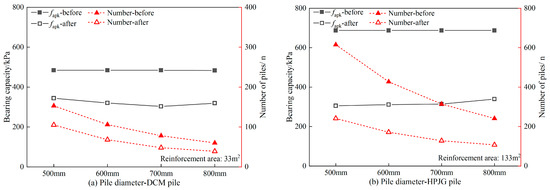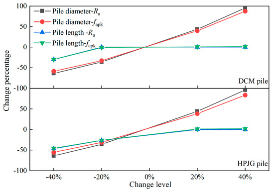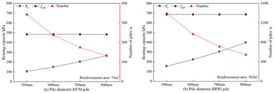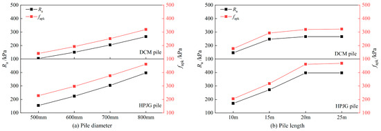 The influence of geological variability on the selection of pile dimensions mainly includes the diameter and length of the piles. In this section, piles with a diameter of 800 mm and a length of 20 m are used as the comparison benchmark. The variation in the pile bearing capacity caused by pile dimension can be calculated using Equations (1)–(3). Figure 5 illustrates the impact of two types of pile sizes (DCM and HPJG) on the bearing capacity. Figure 5a shows the relationship between the diameters and their respective Ra and fapk values. An increase in the pile diameter led to a linear increase in both Ra and fapk for these piles while maintaining a 1 m pile spacing. Ra reflects the bearing capacity of the pile and is directly related to its diameter. A larger diameter can withstand greater vertical loads. fapk indicates the interaction between the bearing capacity of the pile and the surrounding soil; piles with larger diameters transfer loads more effectively to the surrounding soil, thereby increasing the bearing capacity of the adjacent soil. Figure 5b illustrates the relationship between the lengths and their respective Ra and fapk values. For both the DCM and HPJG piles, Ra and fapk generally increased with the pile length; however, beyond a certain length, additional increases had a marginal effect on enhancing the bearing capacity. This limitation stems from the definitions of the design standards for calculating individual pile bearing capacities. In shallow strata, the bearing capacity of a single pile is primarily determined by qsia and qp in contact with the soil layer. In deep strata, the bearing capacity of a single pile is mainly determined by the compressive strength of the pile; hence, the bearing capacity no longer increases with increasing pile length. Therefore, from a design perspective, excessively long piles not only contribute to unnecessary construction waste but also offer limited benefits in terms of enhancing bearing capacity.