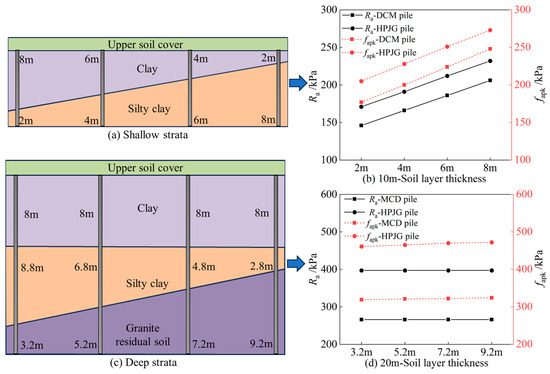 The variation in the pile bearing capacity caused by the spatial distribution of the soil layers can be calculated using Equations (1)–(3), as shown in Figure 6. In this study, the boundary between shallow and deep strata is defined at 10 m below the surface. Figure 6a shows the soil structure transitioning from upper clay to sandy clay in the shallow strata, where the thickness of the soil layer adjacent to the pile varies by location. Figure 6b shows the variation pattern of bearing capacity in this situation. In shallow strata, the bearing capacity of a pile depends on the influence of the side resistance, primarily determined by the interface friction between the pile side and the soil. As the thickness of the sandy clay layer gradually increased, the bearing capacity correspondingly increased. In the deep strata, Figure 6c depicts a deep soil structure transitioning from upper silty clay to granite residual soil. In the deep strata, the bearing capacity of a pile is less influenced by side resistance and is primarily determined by the contact between the pile tip and the soil. As the thickness of the granite residual soil gradually increased, the single-pile bearing capacities for both construction methods remained stable, indicating that the designed bearing capacity of piles in deep strata primarily relies on the compressive strength of the pile itself (Figure 6d). Meanwhile, the foundation bearing capacity exhibited a slight increase, primarily because the characteristic values of fsk in the strata change.