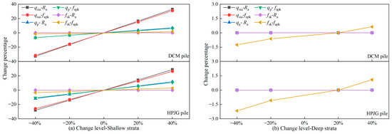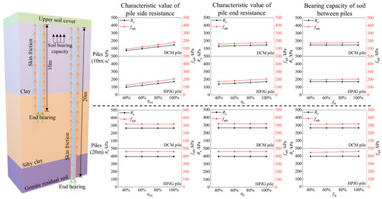 It is important to note that the spatial distribution of soil is not the only factor influencing bearing capacity; the physical and mechanical properties of the soil also have a significant effect. When assessing the bearing capacity, the characteristic values of qsia, qp, and fsk are essential parameters that directly affect the reliability of the pile foundation design. These values are influenced by the physical and mechanical properties of the soil, as detailed in Table 3. As the soil depth increased, the values of c and φ gradually increasd and exhibited a positive correlation with qsia, qp, and fsk. Figure 7 illustrates the variations in the bearing capacities of the DCM and HPJG piles under different stratum conditions. The results demonstrate that in shallow strata, qsia significantly influences the bearing capacity. The bearing capacity of the HPJG piles was marginally higher than that of the DCM piles, suggesting that the pile construction method has a key effect on enhancing bearing capacity. In the deep strata, the impact of the soil layer parameters on the bearing capacity was minimal, whereas the influence of the construction method was more pronounced. The HPJG piles exhibited a significantly greater bearing capacity than the DCM piles, which is attributed to the generally higher compressive strength of the pile body following construction for the HPJG piles.