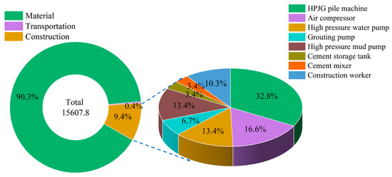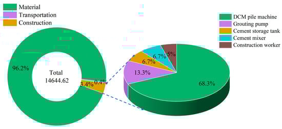 According to Table 6 and Table 7 and Equations (6)–(10), the total GHG emissions for the construction phase of HPJG piles were 15,607.62 kg CO2e, and the GHG emission intensity for HPJG piles was calculated as 156.1 kg CO2e/m, representing a 6.58% increase over DCM piles. Figure 9 illustrates the GHG emission distribution during the construction of DCM piles, where the production of building materials, transportation of building materials, and pile construction stages accounted for 90.3%, 0.4%, and 9.4% of the total emissions, respectively. Among the building materials, cement continues to be the primary source of implicit GHG emissions. Concurrently, the proportion of GHG emissions during the pile construction stage increased, mainly because of the heightened complexity of HPJG pile construction, which involves the extensive use of mechanical equipment.