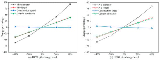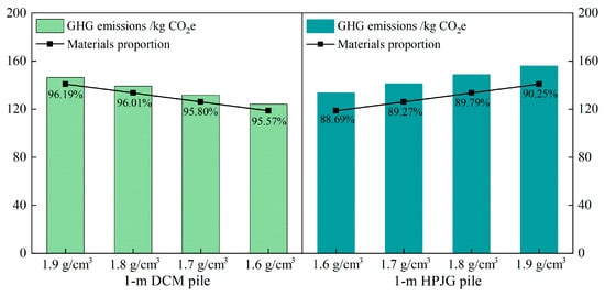 Natural sedimentation processes, geological movements, and human activities can cause variability in the spatial distribution of soils. This variability influences the selection of pile sizes at the design stage. According to the data in Figure 10, an increase in the pile diameter was positively correlated with an increase in the GHG emissions for both types of piles. Specifically, when the pile diameter was 500 mm, the proportions of GHG emissions related to materials for the DCM and HPJG piles were 91.29% and 78.72%, respectively. When the diameter increased to 800 mm, the proportions increased to 96.19% and 90.29%, respectively. This suggests that the pile diameter is directly linked to material usage and predominantly governs GHG emissions. Additionally, the length of the pile exerted a direct linear effect on GHG emissions. This outcome is unsurprising given that the pile length served as the functional unit in the assessments. Therefore, with increasing pile length, the GHG emissions also increased linearly.
