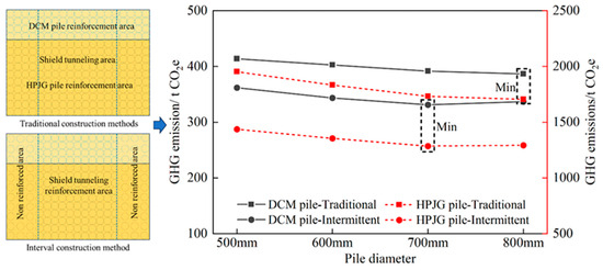 - The design framework proposed in this study facilitated a comprehensive assessment of the environmental impact and bearing performance of the pile foundation design. Remarkably, this innovative construction method can reduce overall GHG emissions by approximately 22.7%. By adopting a novel arrangement scheme that implements overlapping piles in the shield tunneling reinforcement area and spaced piles in non-reinforcement areas, this method not only satisfies the requirements for bearing capacity and impermeability but also significantly reduces GHG emissions.