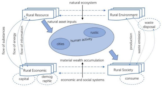 A rural ecosystem refers to the ecological, economic, and technological composite system composed of the rural population, rural environment (light, heat, water, air, soil, etc.), rural organisms (plants, animals, microorganisms), rural buildings (houses), agricultural production tools, rural science and technology, and rural culture within the scope of rural areas. This system is an ecological unit with the basic functions of matter circulation and energy flow [25]. Compared to the general ecosystem, the rural ecosystem is a distinctive artificial and semi-artificial ecosystem, in which many environmental and biological compositions are created and altered by the residents themselves through “labor”. Therefore, the rural ecosystem exhibits structural complexity and functional diversity. It encompasses both a typical natural ecosystem and the pronounced synthetic characteristics of a social–economic system. This comprehensive expression is shaped by the flow of material, energy, and information between humans and external resources, the environment, society, and the economy. The resource and environment subsystems directly influence the input of natural capital, while the social and economic subsystems impact the external drivers of production relations and the accumulation of material wealth in rural populations (Figure 1). With the rapid advancement of urbanization and rural revitalization, the consumption income of rural residents has been increasing [26,27,28]. However, rural ecosystems have been affected to a certain degree. For example, resource wastage, depopulation, and environmental pollution are increasing the pressure on rural ecosystems and decreasing the functionality of ecosystems [29,30,31]. Currently, for many developing countries such as China, South Africa, and India, the most important settlements are still rural areas. Rural environmental health has always been a focal issue for the government, with significant efforts made to enhance and address it [32]. The health of rural ecosystems is vital for promoting sustainable rural development. Research on rural ecosystem health can aid in understanding the underlying causes of rural ecological challenges, guiding rural revitalization, reconstruction, and sustainable development.