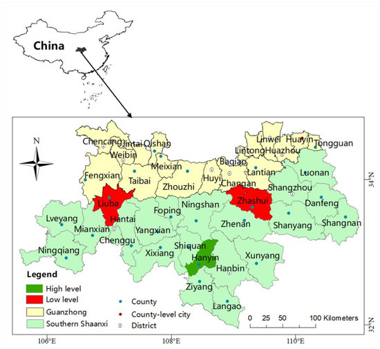 The Qinling Mountains, spanning across Shaanxi, Gansu, Qinghai, and Henan and extending eastwards to the Nanyang and Xiangyang basins, are a mid- to high-altitude mountain range across the center of China. This mountain range is connected to the Qilian Mountains and Kunlun Mountains in the west and Tongbai Mountains and Dabie Mountains in the east. It serves as a natural demarcation line for geography, geology, climate, wildlife, and flora areas in mainland China. In Shaanxi, the Qinling Mountains lean against the Guanzhong Plain to the north and the Hanzhong and Ankang basins to the south. They also act as the watershed dividing the Yellow River and Yangtze River systems, with the mountains rising steeply in the north and gradually sloping in the south. Based on the “Regulations on the Protection of Qinling Ecological Environment”, the scope of Qinling ecological environmental protection encompasses the Qinling Mountain region in Shaanxi Province, bordered by the provincial boundaries in the east and west and by the base of the Qinling Mountains in the north and south [41]. The Qinling Mountains include Shangluo City and parts of Xi’an, Baoji, Weinan, Hanzhong, and Ankang, and can be divided into the Guanzhong region and southern Shaanxi region. The southern Shaanxi mountainous area is vast, characterized by a mild climate, rich species, complex topography, relatively underdeveloped economic and social conditions, and a high poverty rate [42]. The Guanzhong Plain features a vast area, deep loess deposits, and a long history of development. In this study, the 2020 administrative division of Shaanxi Province, including counties, county-level cities, and municipal districts, was used as research units, with a total of 40 geographic units identified. The comprehensive development level is higher in Hanyin County among these 40 counties, due to its abundant natural resources, minimal ecological environmental pollution, good environmental quality, and relatively high level of rural economic development. On the other hand, Liuba County and Zhashui County have a poor comprehensive development level with limited resource conditions, a degraded ecological environment, an underdeveloped rural economy, an unreasonable industrial structure, inadequate infrastructure construction, and low living standards for rural residents (Figure 2).