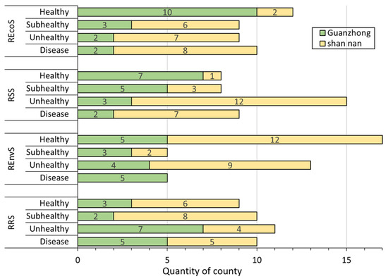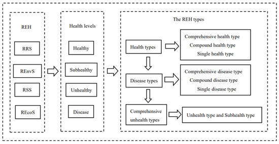 Figure 3. Conceptual diagram of health typology. Notes: REH refers to rural ecosystem health, RRS refers to rural resource subsystem, REnvS refers to rural environmental subsystem, RSS refers to rural social subsystem, and REcoS refers to rural economic subsystem.