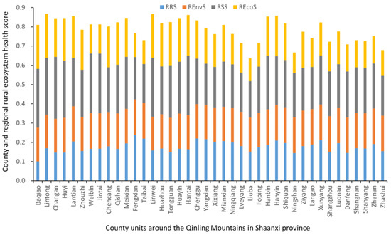 where R R S , R E n v S , R S S , and R E c o S are the scores of each rural ecosystem subsystem;   R E H is the score of the comprehensive rural ecosystem; w i is the indicator weight of each subsystem; S i   is the ecosystem health index of each indicator; p and q are the serial numbers of each indicator in the nth subsystem.