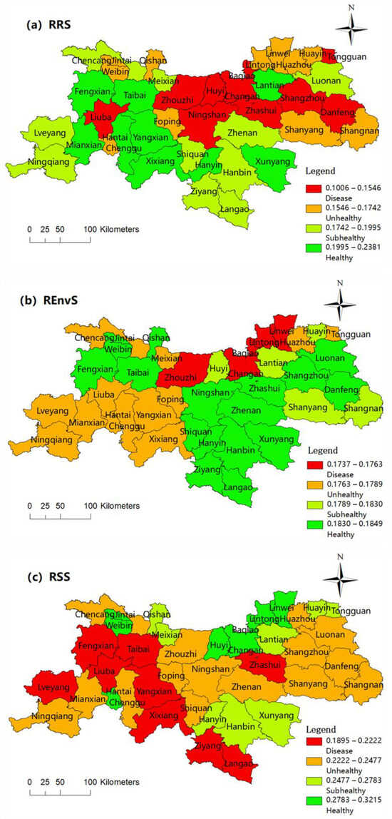 The health scores of rural ecosystems around the Qinling Mountains in Shaanxi Province were generally healthy, showing a fluctuating downward trend from Guanzhong to southern Shaanxi.
