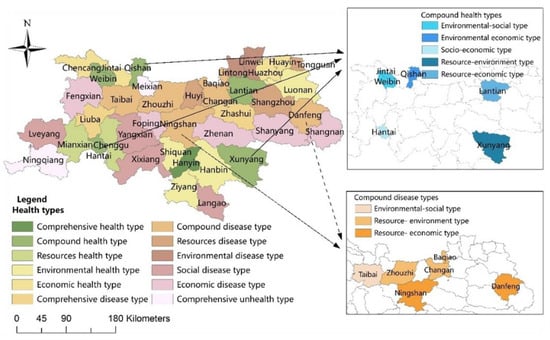According to the principle of categorization, the sub-healthy type of rural ecosystems, positioned between the healthy type and the diseased type, is categorized as other types. The comprehensively unhealthy type includes two counties, Mei County and Ningqiang County, accounting for 5.1% of the total number of counties. The ecosystem health of this type is at a low to medium level in Shaanxi Province, necessitating comprehensive management. This area is pivotal for facilitating the transition from disease types to healthy and sub-healthy types.