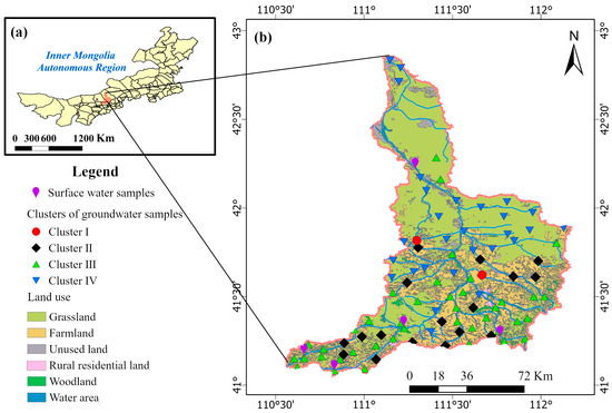 The Tabu River Basin is located in the northern foothills of the Yin Mountains in the Inner Mongolia Autonomous Region (Figure 1a). The terrain slopes from the south to the north, with elevations ranging from 900 to 2100 m. The Tabu River flows from the southwest to the north. The study area has an arid and semi-arid climate with low rainfall and high evaporation rates. The average annual rainfall is 311.2 mm, and the majority of this occurs between July and September, accounting for approximately 80% of the total annual rainfall. The average annual evaporation is 1365.2 mm, and the average annual temperature ranges between 1 and 6 °C. The concentrated rainfall and extensive evaporation have led to prolonged drought conditions for most surface water. Meanwhile, the majority of surface water in the research area is mainly replenished by groundwater, as it remains dry for long periods except during the rainy season. The primary land use types in the study area are grassland and farmland, and industrial activities are limited in this area (Figure 1b). The grassland is primarily located downstream of the Tabu River, whereas farmland is mainly found in the middle and upper reaches (Figure 1b). Livestock (cattle and sheep) and crop production are integrated at the household level in the Tabu River Basin. In this region, livestock manure is commonly used as a plant fertilizer after qualified preparation. Due to the lack of surface water, groundwater acts as the primary water source for agricultural activities in the grassland and farmland of the Tabu River Basin. Therefore, the management of groundwater resources is crucial for sustainable development in the study area.