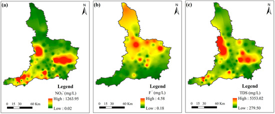 Spatial distributions of (a) NO3−, (b) F−, and (c) TDS in the groundwater of the Tabu River Basin.