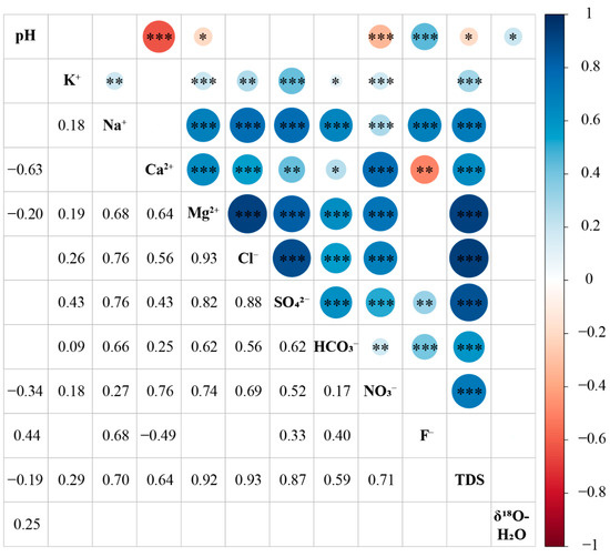 Spearman correlation heatmap; the correlation coefficients and significance levels are based on the hydrogeochemical and isotopic parameters. The symbols *, **, and *** represent statistical significance levels of p < 0.05, p < 0.01, and p < 0.001, respectively. Hypothesis testing was employed to evaluate the significance of the correlations among various hydrogeochemical and isotopic parameters.