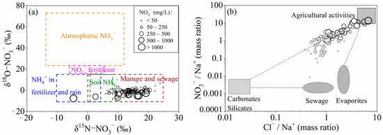 Relationships between (a) δ15N-NO3− vs. δ18O-NO3− and (b) Cl−/Na+ vs. NO3−/Na+. The typical ranges of NO3− end-members, including atmospheric NO3−, chemical fertilizer, NH4+ in fertilizer and rain, soil N, manure, and sewage, were derived from Xue et al. [45] and Kendall et al. [46].