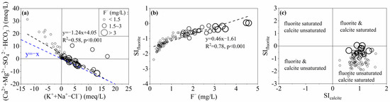 Relationships between (a) (Na+ + K+ − Cl−) vs. (Ca2+ + Mg2+) − (HCO3− + SO42−), (b) F− vs. SIfluorite, and (c) SIcalcite vs. SIfluorite.