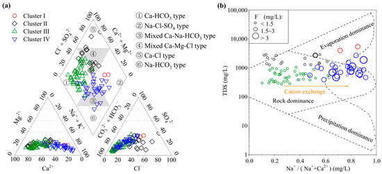 Cluster I was identified as Na-Cl·SO4 groundwater (Figure 7a) with a high TDS (median: 4709.2 mg/L; Table S2). Cluster II was identified as mixed Ca·Mg-Cl groundwater with a high TDS (median: 1661.8 mg/L; Table S2). Both clusters I and II were seriously influenced by anthropogenic factors, but their major cations showed significant differences, which might be attributed to geogenic processes. As shown in Figure 7b, the Gibbs diagram indicated that cluster I was located in the zone of evaporation dominance, whereas cluster II was distributed in the zone of rock dominance. The precipitation of Ca2+ and Mg2+ occurs prior to Na+ under alkaline conditions [55]. Thus, the percentage of Na+ increased, whereas that of Ca2+ and Mg2+ decreased during the evaporation process. Therefore, the difference in major cations between clusters I and II was primarily attributed to evaporation.