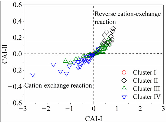 Cluster III was identified as Ca-HCO3 groundwater (Figure 7a) with a low TDS (median: 538.4 mg/L; Table S2). Cluster IV was identified as mixed Ca·Na-HCO3 groundwater (Figure 7a) with a low TDS (median: 795.4 mg/L; Table S2). Both clusters III and IV were slightly polluted by anthropogenic inputs. The percentage of Na+ in the groundwater of cluster IV was higher than that of cluster III. The Gibbs diagram indicates that the cation-exchange process occurred in the groundwater of cluster III and IV, which might contribute to the difference in the major cation (Figure 7b). The chloro-alkaline indices (CAI-I and CAI-II) refer to ion exchange processes that take place when one ion is substituted by another ion at the solid material surface of soil or rock, such as clay minerals, organic matter, or metal oxyhydroxides [56]. Therefore, CAIs were used to assess the impact of the cation-exchange process in this study (Figure 8). Higher absolute values of these indices indicate a stronger cation exchange in the groundwater environment [57]. The cluster IV groundwater was primarily located in the cation-exchange zone (Figure 8), indicating the substitution of Ca2+ by Na+ (Equation (14)) [11]. Conversely, the groundwater of cluster III was mainly located in the reverse cation-exchange zone (Figure 8), indicating the substitution of Na+ by Ca2+. Therefore, the process of cation exchange led to a higher proportion of Na+ in the cluster IV samples in comparison to the cluster III samples.