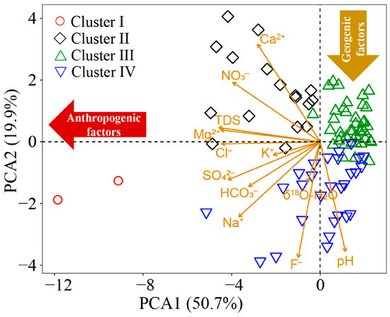 As shown in Figure 9, PCA based on the hydrogeochemical parameters and δ18O-H2O explained 70.6% of the variance between the groundwater samples using the first two principal components (PC1 and PC2). PC1, which accounted for 50.7% of the variance, exhibited a negative correlation with NO3−, TDS, Mg2+, Cl−, SO42−, HCO3−, and Na+ (Table S4). As agricultural activity enhanced the inputs of NO3−, SO42−, Cl−, and TDS, PC1 can be interpreted as those anthropogenic factors influencing groundwater quality. PC2 explained 19.9% of the variance, which was negatively correlated with pH, F−, Na+, and HCO3−, but positively correlated with Ca2+ (Table S4). In the negative direction of PC2, F− was positively correlated with pH and HCO3− (Figure 9), indicating the influences of alkaline conditions and competitive adsorption on the enrichment of F− [6,10]. In the positive direction of PC2, Ca2+ was negatively correlated with F− and Na+, suggesting the influences of cation exchange and fluorine-bearing mineral dissolution on the enrichment of F− [12]. Therefore, PC2 could be interpreted as geogenic factors regulating the enrichment of F− in groundwater. The results of the PCA further demonstrated that the enrichment of NO3− and F− was dominated by anthropogenic and geogenic factors, respectively.