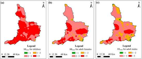 The long-term consumption of groundwater contaminated with NO3− and F− may pose health risks to humans, particularly when used as a source of daily drinking and bathing water without proper precautions being taken [5]. Thus, NO3− and F− were considered in the assessment of non-carcinogenic risk for children and adults (females and males) [58]. As exhibited in Table S5, the HItotal varied between 0.97 and 39.50 (median: 4.79) for children, 0.57 and 23.09 for adult females (median: 2.80), and 0.42 and 16.96 for adult males (median: 2.06). A total of 86.2%, 60.9%, and 51.7% of the groundwater samples were found to exceed the permissible limit (HItotal = 1) for children, adult females, and adult males, respectively. Moreover, the spatial distribution of HItotal indicated that groundwater posed a potential risk to children, adult females, and adult males in almost the whole Tabu River Basin (Figure 10a–c). Therefore, the phreatic groundwater environment of the Tabu River Basin is facing challenges. The health threats of NO3− and F− to humans through both oral and dermal contact followed the order of children > adult females > adult males.