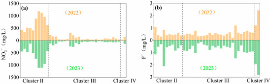 Comparison of (a) NO3− and (b) F− in groundwater between 2022 and 2023. The classification was based on the results of the HCA of groundwater samples in 2022.