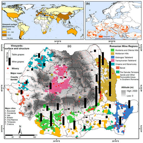Extension and main characteristics of Romanian vineyards at (a) world, (b) European, and (c) national level. Source: Authors’ elaboration, by processing data from geo-spatial.org; naturalearthdata.com; OM 1205/2018; CLC2018; NIS, 2024 [76,77,78,79].