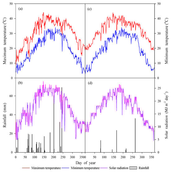 Maximum and minimum temperatures (a,c), rainfall, and solar radiation (b,d) during 2020 (a,b) and 2021 (c,d) at the study site.