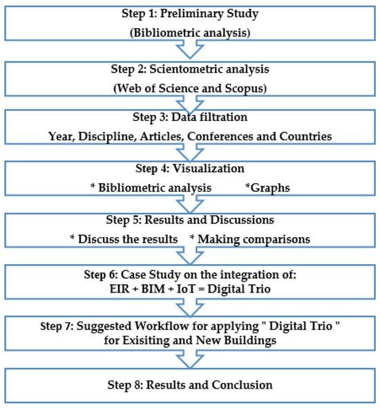 Figure 1 illustrates the research methodology, which begins with reviewing the state of the art in previous research and analyzing the data, found in two databases, Web of Science and Scopus, on digital twins in the AEC-FM industry. Suitable filtration was applied using the VOS viewer for data analysis.
