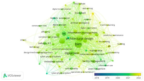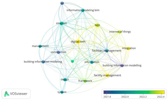 Key terms, such as “digital twin”, “facility management”, “BIM”, and “integration”, are interconnected with robust lines, indicating strong and growing relationships among these concepts. The node for “digital twin” is closely aligned with “BIM”, signifying digital twin’s rising importance as a method of virtual representation in BIM processes, as shown in Figure 2.