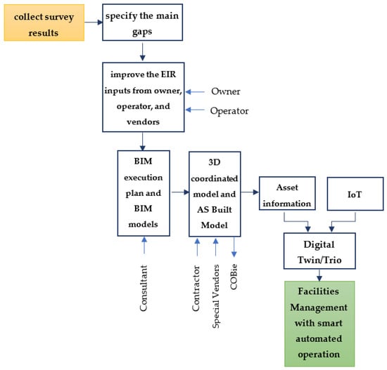 As shown in Figure 14, using the Integration of EIR, BIM, and IOT in a new expression “digital trio” will lead directly to enhance the operations and maintenance of any building by using the digital trio workflow in order to improve facilities management with smart automated operation in the construction industry.