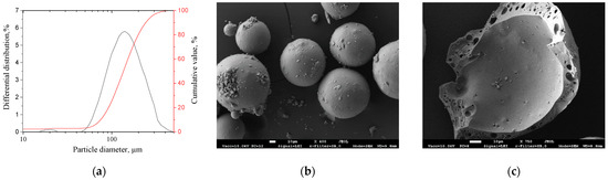FAC size varied in quite a wide range, ~50–400 μm, with the prevailing particle size approximately ~140 μm (Figure 1a). FAC shells have a spherical shape (Figure 1b) with porous walls with thicknesses ranging from 1 to 2 μm up to 10 to 15 μm (Figure 1c).
