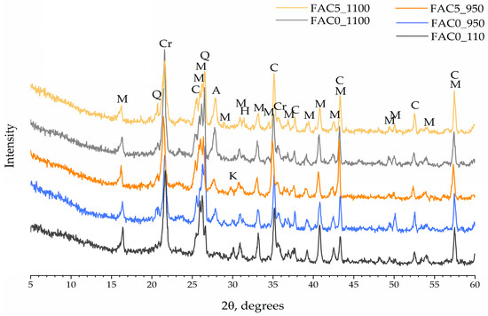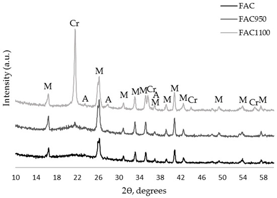 X-ray diffraction patterns of raw FACs and FACs after heat treatment at 950 °C and 1100 °C: M—mullite, Cr—cristobalite, A—anorthite.