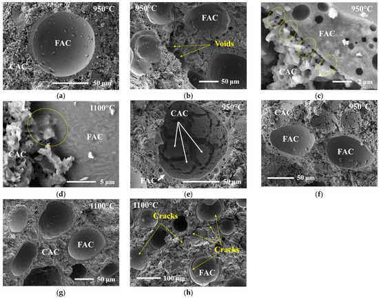 In general, most of the FAC particles retained their good contact with the CAC matrix (Figure 9d). The plane of fracture of the particles coincides with the plane of fracture of the matrix, indicating that the FAC particles are sufficiently firmly bound to the matrix and work as a whole. However, for samples fired at 1100 °C temperature, the more expressed FACs trend to crack without (Figure 9e) or with (Figure 9f) previous plastic deformation may be pointed out. When fired at 950 °C, FAC particles are more prone to plastic deformation without fracture. It can be observed from Figure 9f also the formation of a visible gap between the CAC matrix and the FAC, which can be attributed to the increased thermal expansion coefficient of FACs after the formation of cristobalite, which firstly causes more significant plastic deformation, when CAC matrix constrains free FAC expansion and then leads to a more significant shrinkage. The gap formed may act as a defect for crack initiation; on the other hand, it may stop or reflect propagating cracks as well.