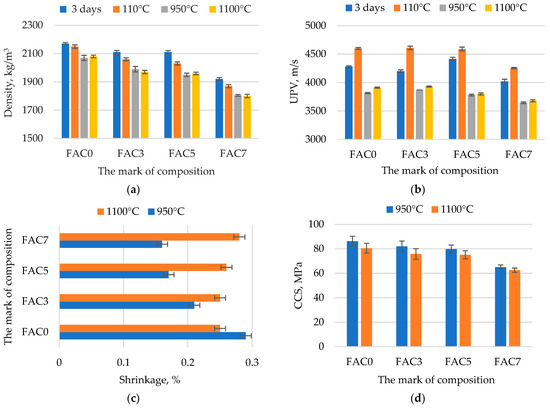 The addition of FACs reduces the density of modified concrete due to the form and structure, low density, and high porosity of cenospheres [43,44,45]. We observed a 3–5% and 3–6% drop in density at 3 days of curing when ground fireclay was replaced by FACs at 3% and 5% (Figure 5a); 7% of FACs resulted in a 12–14% density drop, which cannot be explained only by the replacement of ground fireclay with FACs. Another reason confirmed by the microscopic examination is the accumulation of cenospheres and voids not filled with cement between them (Figure 3h). The reduction of density in dried and fired samples as compared to the cured samples is, first of all, related to the removal of unbound water and further dissociation of hydrates. The density of the samples fired at 950 °C and 1100 °C was 1805–1990 kg/m3 and 1800–1970 kg/m3, respectively. The difference is insignificant and depends mainly on the FAC content, indicating that the phase transformations ongoing in the material in this temperature range did not remarkably affect the final density of the samples.