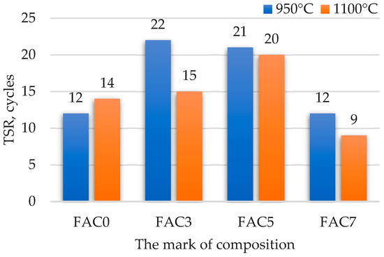 The addition of 5% FACs significantly improves thermal shock resistance (TSR) (Figure 6); a 75% improvement was observed after firing the samples at 950 °C and 43% at 1100 °C. The increased temperature gradient explains the lower effect of improvement at a higher temperature. The improvement was not so stable in the sample containing 3% FACs, and the effect was related to the initial firing temperature. A higher FAC content can have a negative impact on TSR. Compared to the reference, TSR decreased by 35.7% in the samples containing 7% FACs. A more visible positive effect of FACs may be noted when MCC is fired at 950 °C. There are two possible reasons for that. First, as the XRD results revealed (Figure 2), the major part of the amorphous phase remained in the FACs after firing at 950 °C, while at 1100 °C, more brittle cristobalite is formed. Second, the initial firing at a higher temperature (1100 °C) induces greater damage to the material (both FACs and concrete).